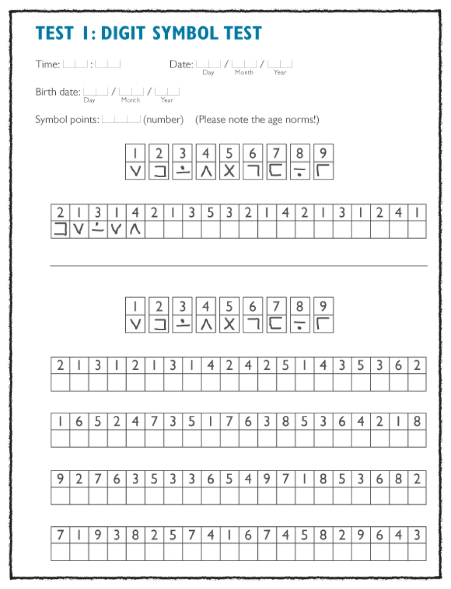 Well-validated and easily quantifiable psychometric test procedures, which determine deficits in psychomotor performance speed and visual constructive ability, are the number connection test (NCT), versions A and B, the digit symbol test, the serial dotting test, and the line tracing test. These tests are simple to explain to the patient, quick to perform, and easy to evaluate.1