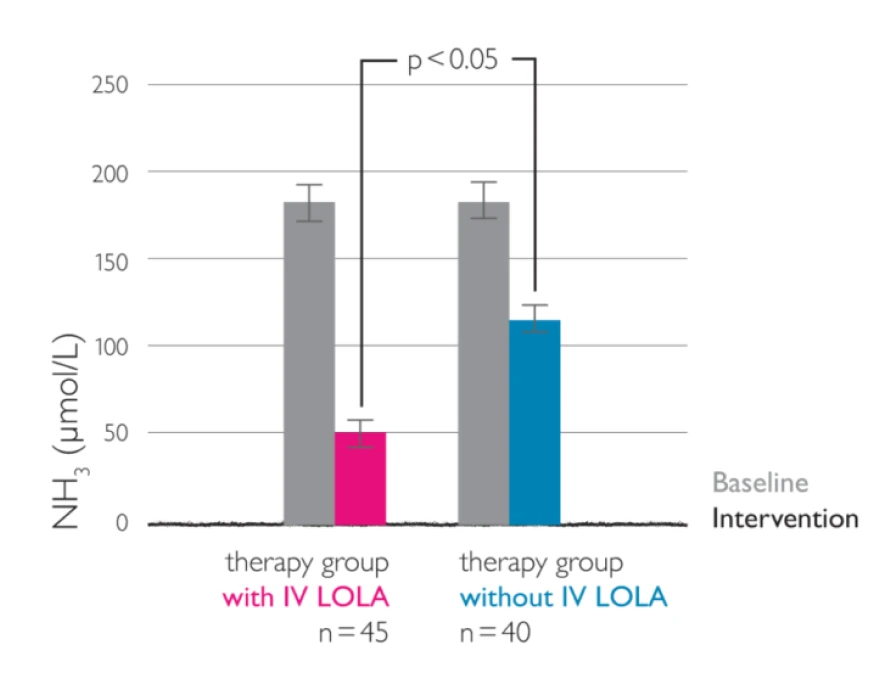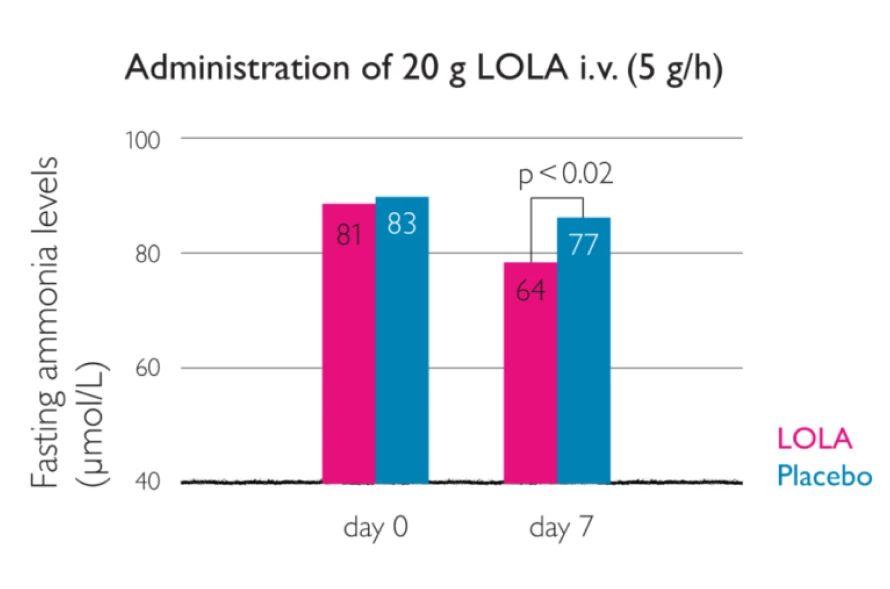 Measurement of ammonia concentration has been included in clinical trials as a key feature on the mechanism of action. A close relationship has been demonstrated between changes in the ammonia concentrations on treatment with LOLA and the clinical therapeutic efficacy.