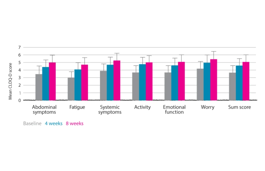 Assessment of HRQOL measures during eight-week treatment with LOLA. Self-assessment by patient using German-validated version of Chronic Liver Disease Questionnaire (CLDQ-D).7