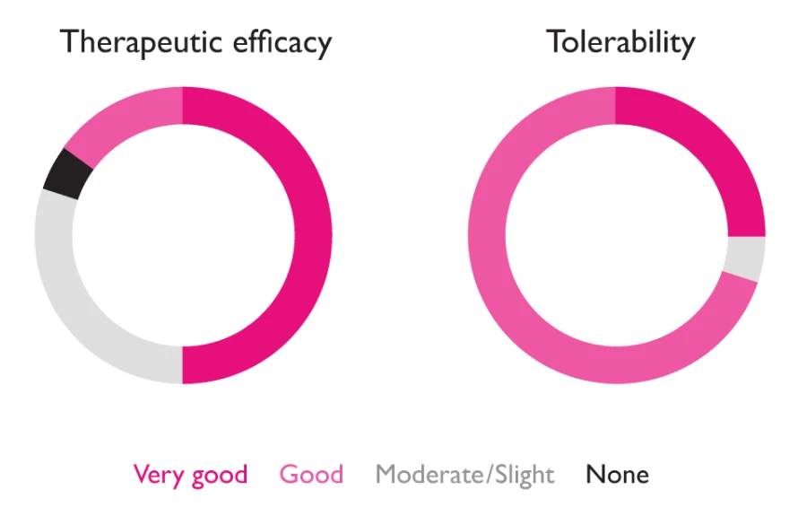 Overall assessment of the efficacy (left) and tolerability (right) of treatment with LOLA granules at the end of treatment, shown as percentages.7