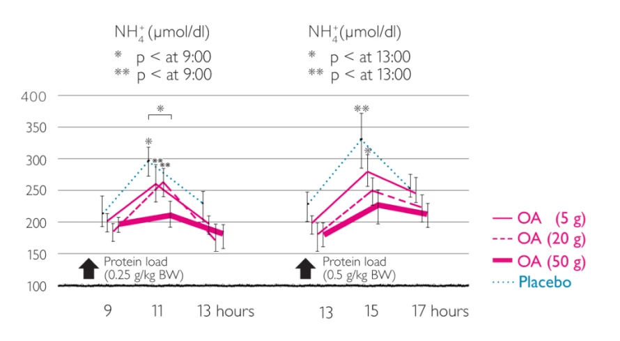 - reduction of postprandial venous ammonia concentrations (p<0.01)