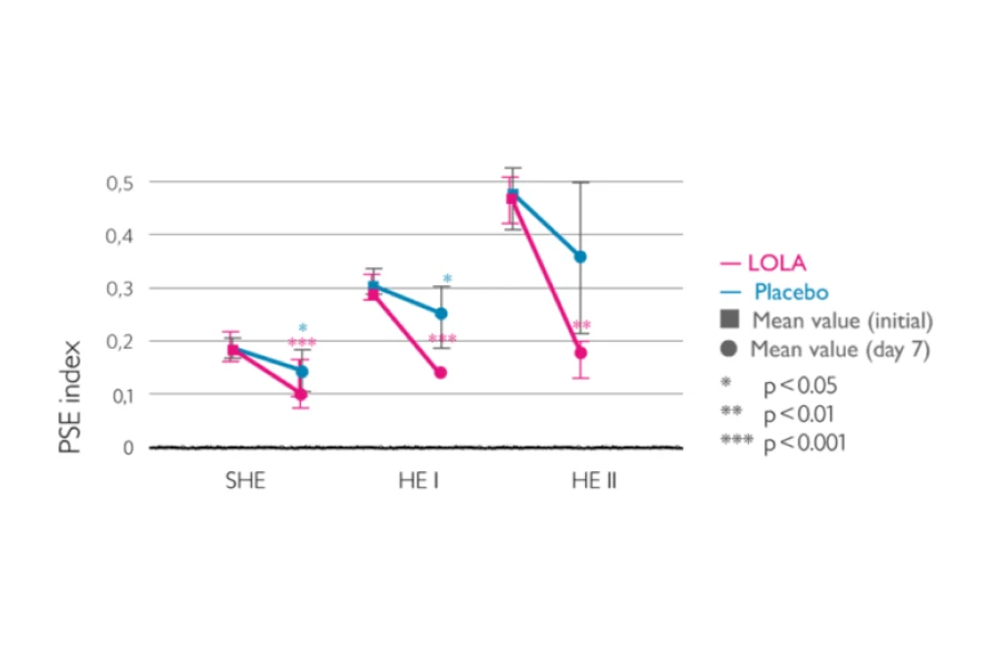 With respect to its efficacy in cirrhosis and HE ranging from MHE to grade II, treatment with LOLA in comparison with placebo shows that: