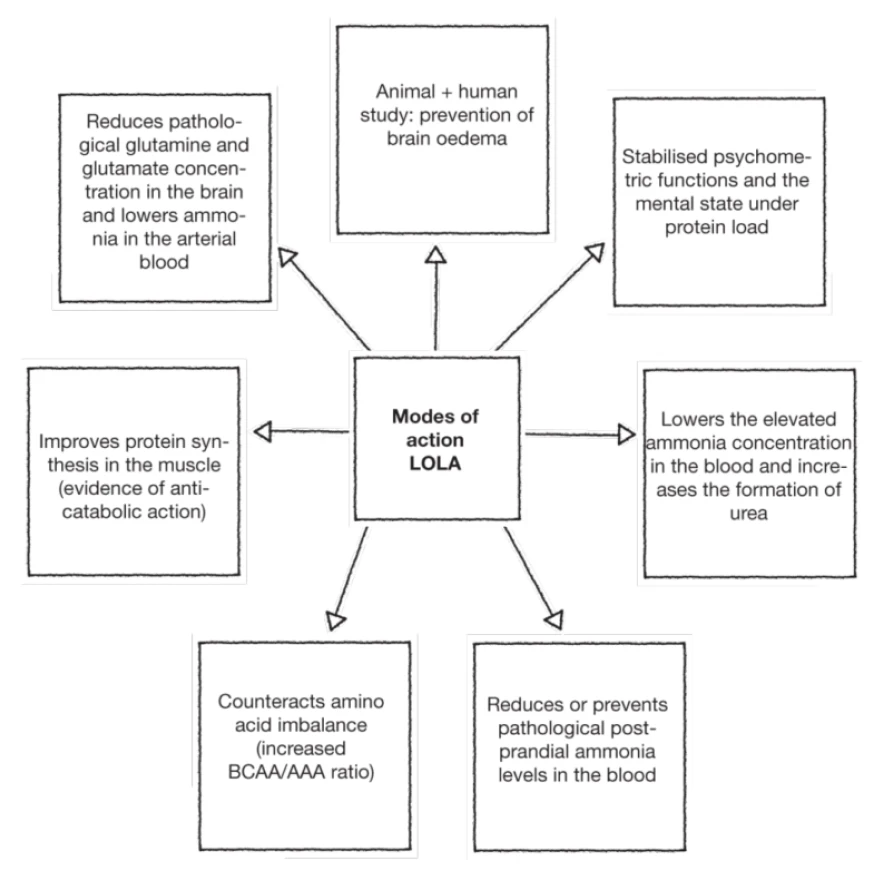 LOLA increases the reversible detoxification of ammonia systemically via glutamine synthesis in the brain and muscles. Aspartate and glutamate are taken up almost exclusively by perivenous liver cells. They serve as a carbon skeleton source to enhance the impaired glutamine synthesis in defective perivenous livers cells of cirrhotic patients.