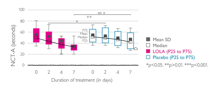 Effects of LOLA (left) vs placebo (right) on the time required to perform NCT-A. Figures given are the mean (black square) and standard deviation, median (white square), 25th and 75th percentiles, and the group differences between the two treatments.2