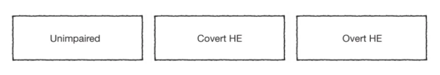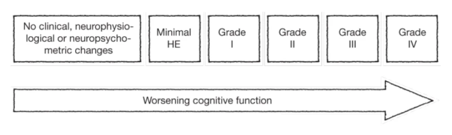 Overt hepatic encephalopathy (HE) is traditionally classified into four grades according to the West Haven criteria. These widely used criteria classifies HE into 5 grades (ranging from minimal [grade 0] to coma [grade 4] based on the patient’s level of consciousness, intellectual function and behaviour, as detailed in the table below. Stage 0 corresponds to the subtype of HE called minimal hepatic encephalopathy (MHE), which is highly prevalent (22-74%) among patients with liver dysfunction. MHE is defined as HE without grossly evident neurologic abnormalities, but with cognitive deficits that can be revealed by psychometric testing.1,3